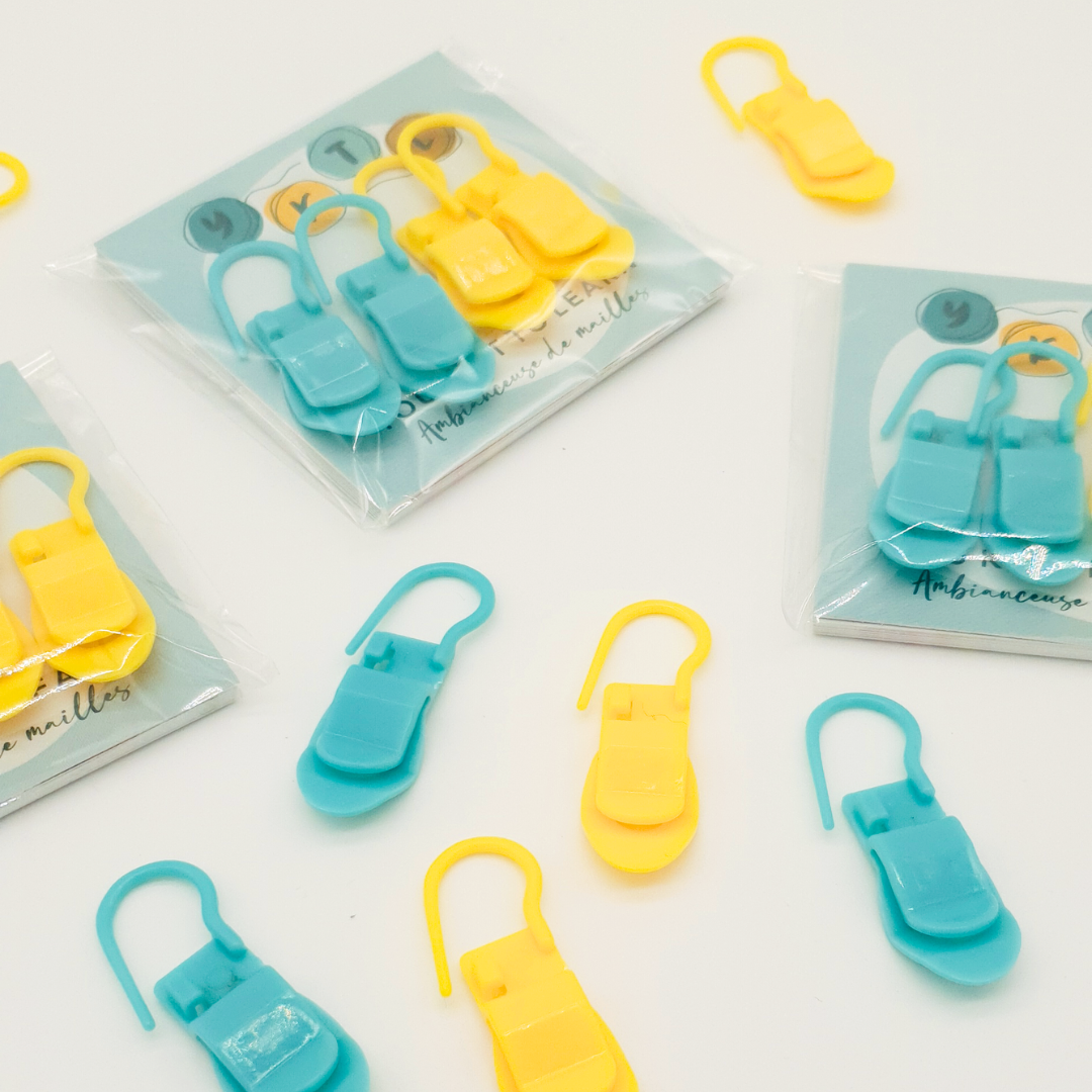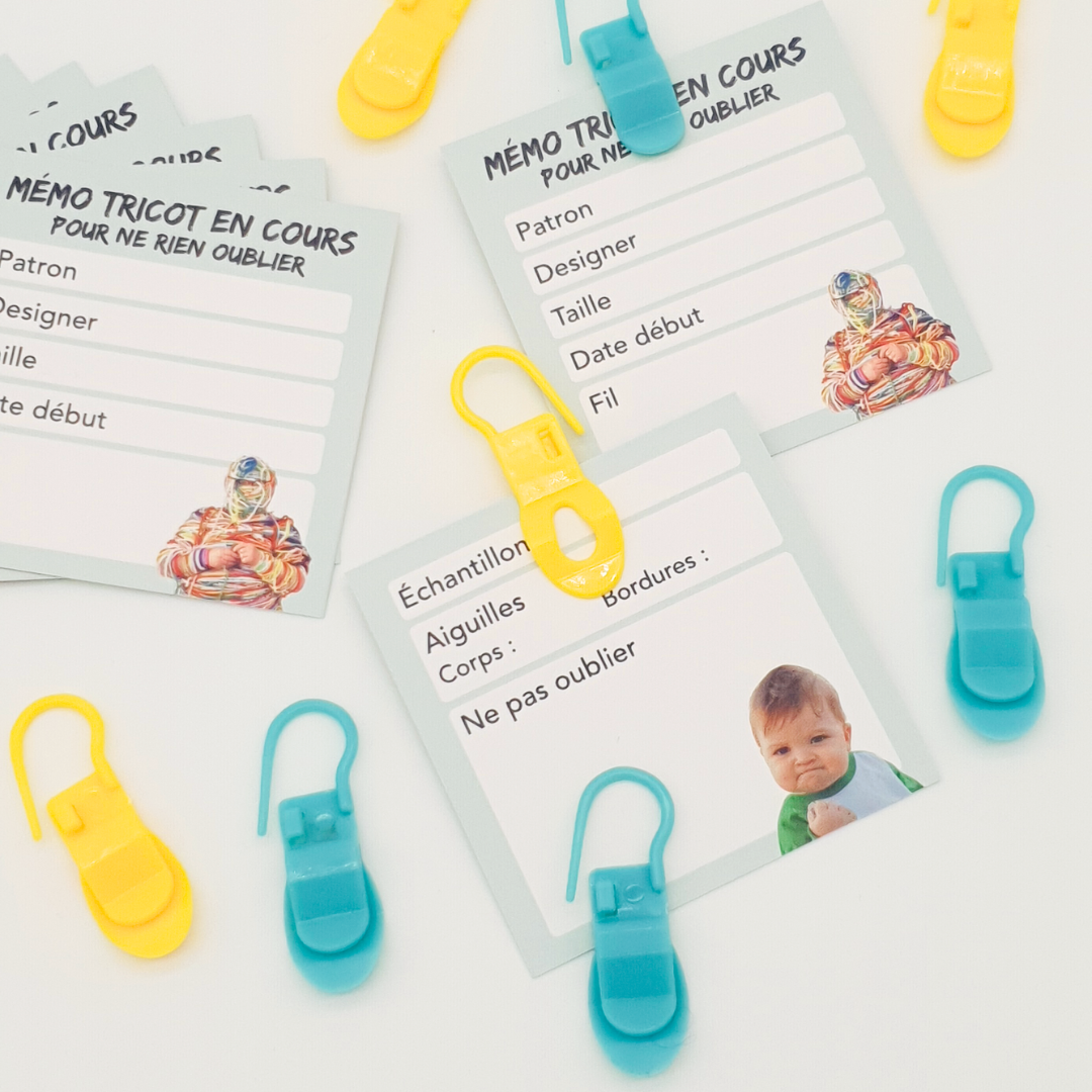 Ils vous permettent d’y accrocher une carte “tricot en cours” pour noter toutes les informations essentielles : taille d’aiguille, nombre de mailles, patron, laine utilisée… bref, tout ce qu’on oublie quand on reprend son projet plusieurs semaines (ou mois ?) plus tard. Ils sont particulièrement pratiques pour les paires de chaussettes, afin de reproduire la seconde à l’identique sans avoir à tout recompter.