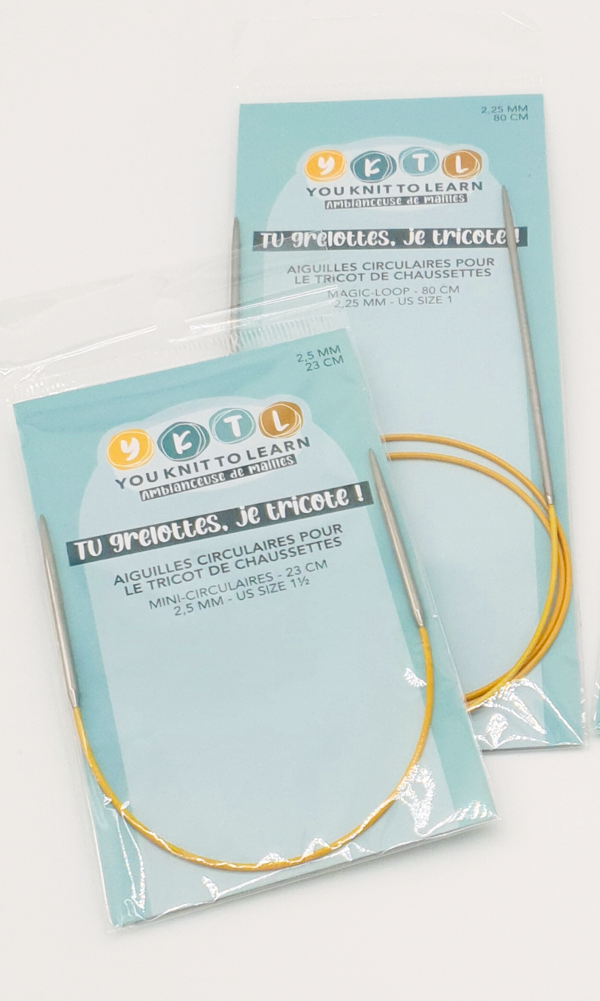 - 1 duo d’aiguilles You Knit To Learn (mini-circulaires + longues), diamètre au choix